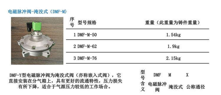 DMY-Y76S淹沒式電磁脈沖閥是脈沖袋式除塵器清灰噴吹系統的壓縮空氣“開關”.DMY-Y76S淹沒式電磁脈沖閥直接安裝在氣包上,具有 的直通噴吹,工作氣源損換較小.